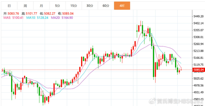 黄金技术面分析:黄金周四承压均线下跌收阴,本周行情空头占据主导地位,大跌之后而想要短期企稳,还缺一个二次下探底部,但不能失守大阴低点,出一个次低点方可企稳,也就是5000关口必须要坚守,二次下探之后再向上突破站上短期均线5日、10日,那么震荡就会从弱势转为强势,继续朝5400-5500高位去试探;而一旦失守5000点,则可能继续向下轨4850试探,昨日黄金早盘冲高,午后承压5195冲高回落,下方618分割位置并未起到效果;整个欧盘震荡下行,高点逐步下移,因此美盘我们看继续下行;目前日线收阴下破中轨,5ma与10ma死叉向下,今日黄金还有进一步向下动能,在美盘非农前可继续保持高空布局策略,日内上方关注5110以及5140两个阻力位,下方关注5050以及5000关口支撑位,重点关注5000破位情况。综合来看,黄金今日短线操作思路上贺博生建议以反弹高空为主,回踩低多为辅,上方短期重点关注5130-5180一线阻力,下方短期重点关注5030-4980一线支撑。